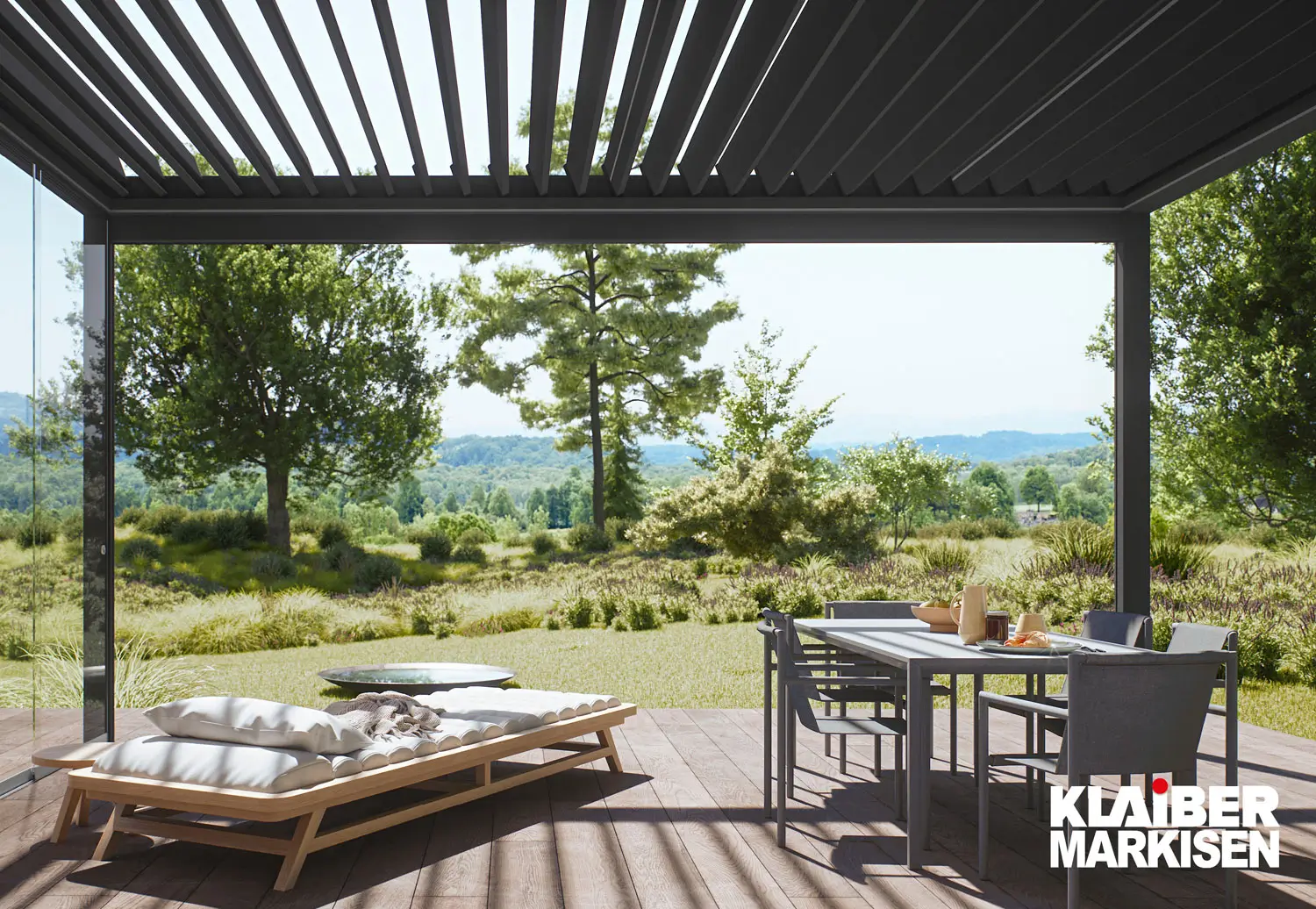 Ein Lamellendach wie das BAVONA von KLAIBER verbindet technische Perfektion mit moderner Architektur.
